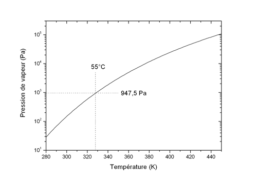 L’octaméthylcyclotétrasiloxane est une substance de classe 3 à toxicité aiguë. Il faut éviter toute inhalation, ingestion, tout contact avec la peau ou les yeux. C’est un produit inflammable produisant des fumées toxiques lors sa combustion. C’est également un polluant pour les milieux aquatiques. Les paramètres de la loi d’Antoine donnés par la base NIST [1] (National Institute of Standards and Technology) d’après R. C. OSTHOFF [2] sont reportés ci-dessous. La pression de vapeur saturante en fonction de la température est représentée sur la figure 3. Pour tous les matériaux élaborés dans cette étude, le précurseur est maintenu à 55° C.