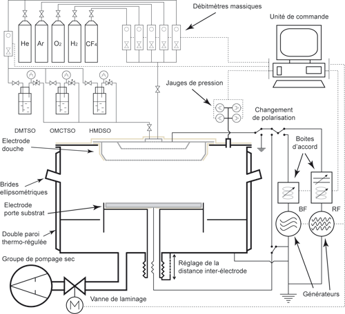 Le réacteur de dépôt a été spécialement conçu par nos soins dans le cadre de la thèse et pour les besoins des travaux de thèse. Il est représenté de manière schématique sur la figure 1. Il est composé d’une enceinte cylindrique de 400 mm de diamètre en acier inoxydable (Z2 CND 17.12) munie d’une double paroi afin de permettre la thermalisation du réacteur. L’enceinte est pourvue de différents piquages pour toutes les fonctions standard : hublot de visualisation, bride de pompage, remise à la pression atmosphérique, pompage, mesures ellipsométriques, mesures de pression et injection des gaz. L’introduction des échantillons se fait par le dessus grâce à une bride sur charnière. L’enceinte a été réalisée à façon par MECA 2000. Le mise sous vide est assurée par un groupe de pompage sec (pompe primaire et roots) Alcatel 601 d’une capacité de 600m3·h−1 et permettant d’atteindre un vide limite de 1 Pa. La régulation du pompage est assurée par une vanne de laminage automatique VAT. L’introduction des gaz est contrôlée par des débitmètres massiques MKS. La pression est mesurée par des jauges capacitives MKS de type Baratron de 1 mbar, 10 mbar et 1 bar.